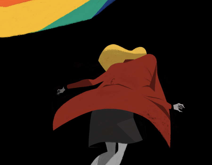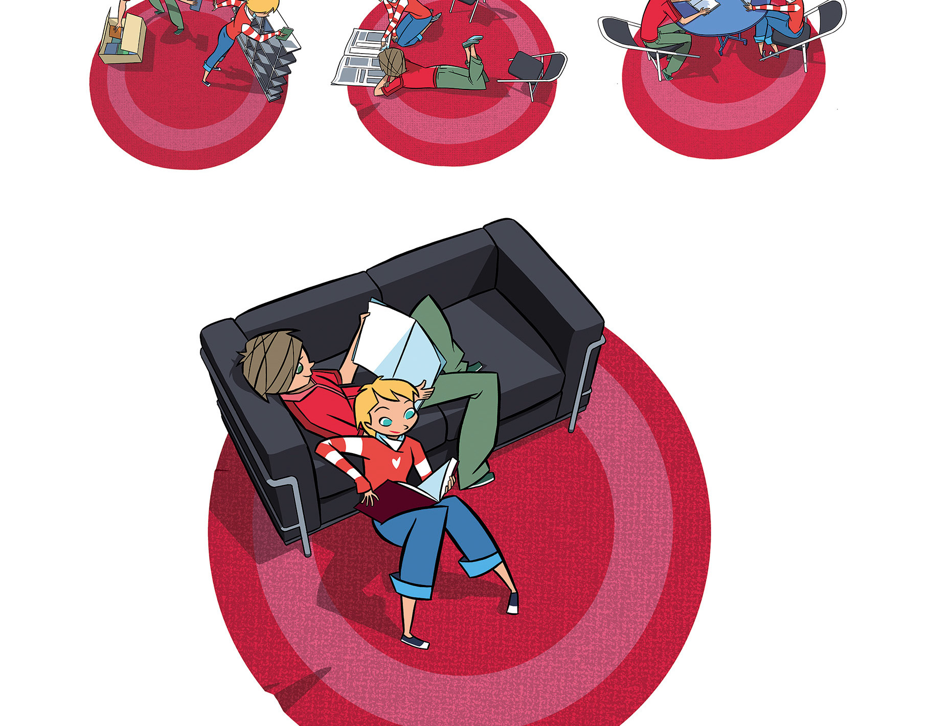 In these illustrations it is shown the story of the couple, from the beginning, when they are centered and united, and how gradually they spread over time and illustrations. The distance between the characters is shown also in the image until we get to the unfolded pages of the last illustration.